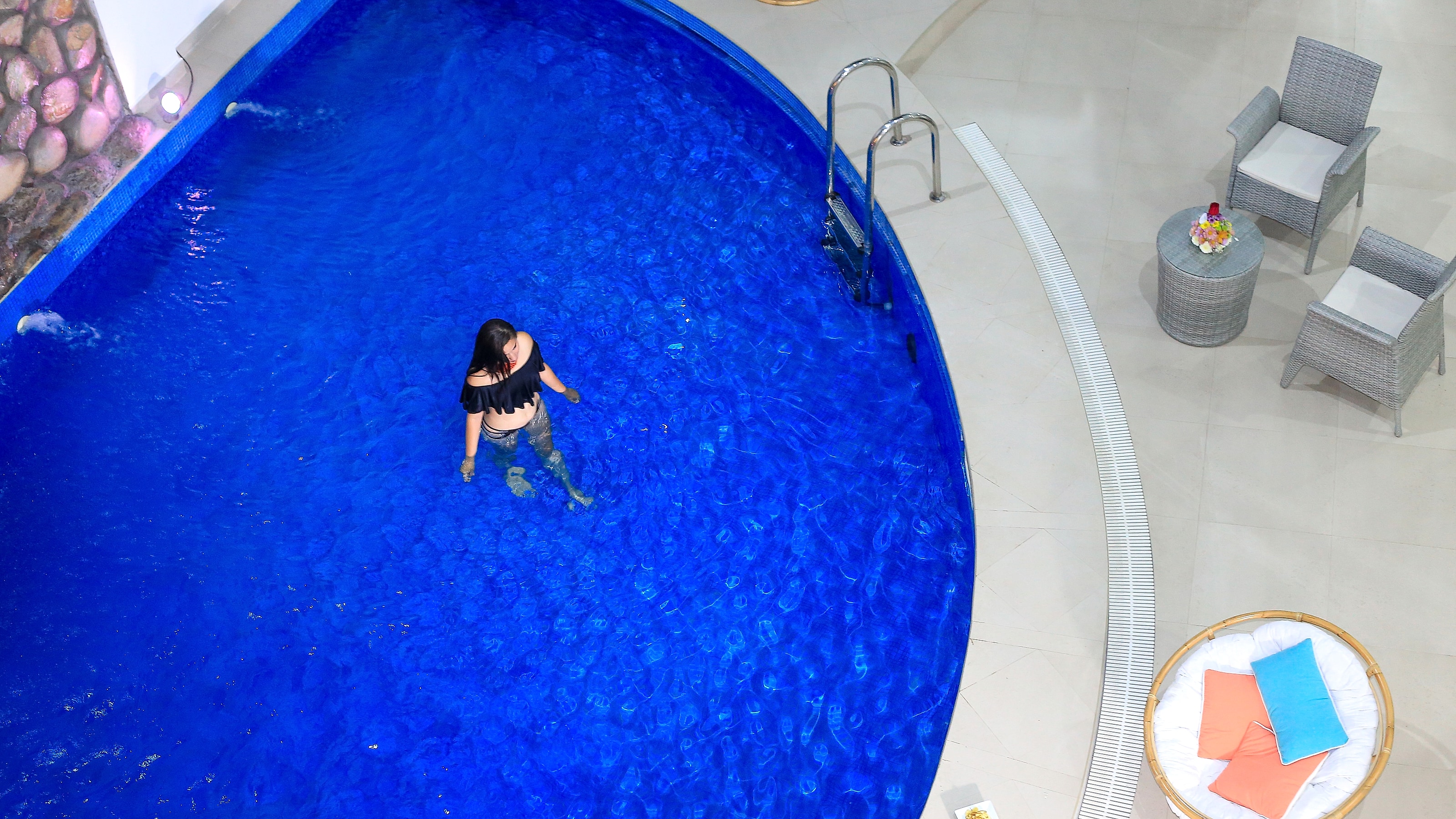 Piscina, habitaciones y ambientes serenos presentados con una lectura más limpia.